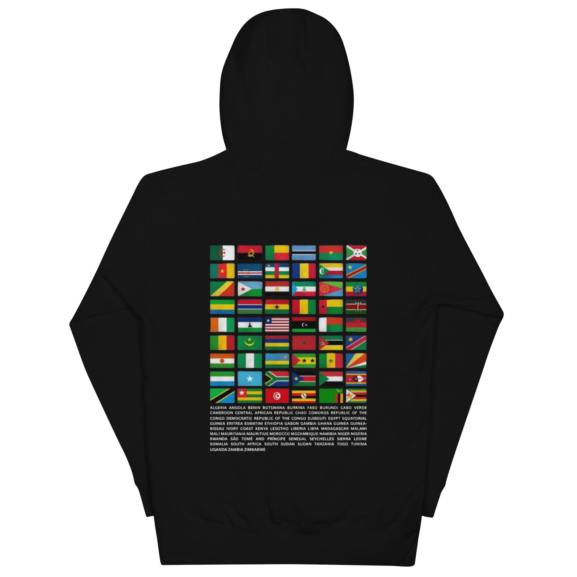 A bold and vibrant display of all 54 African national flags, beautifully arranged in alphabetical order with each country’s name below.
