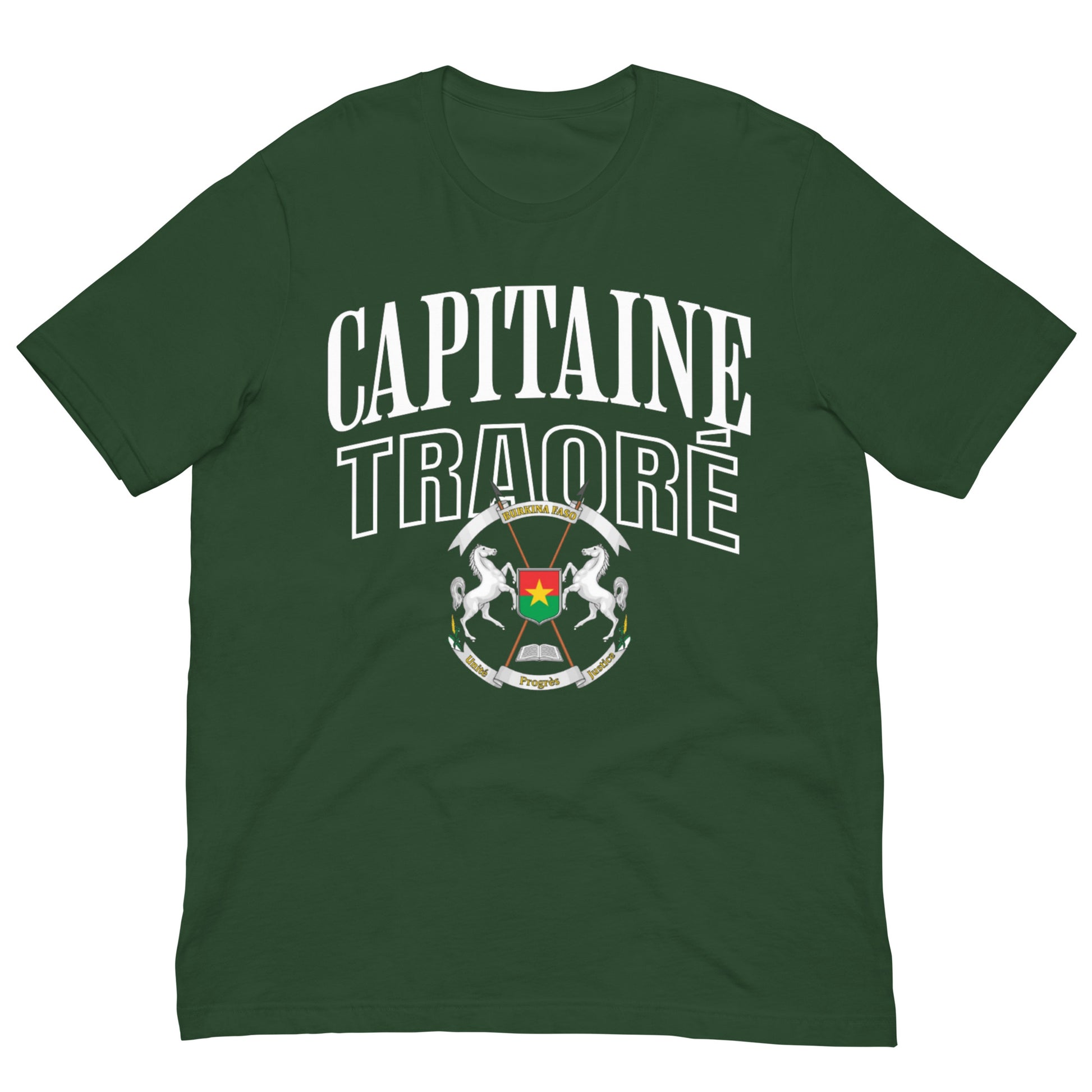 Inspired by Capitaine Traoré’s revolutionary spirit, the design features bold lettering and accents, anchored by the national crest of Burkina Faso on a military green canvas—capturing the spirit of a rising Africa.