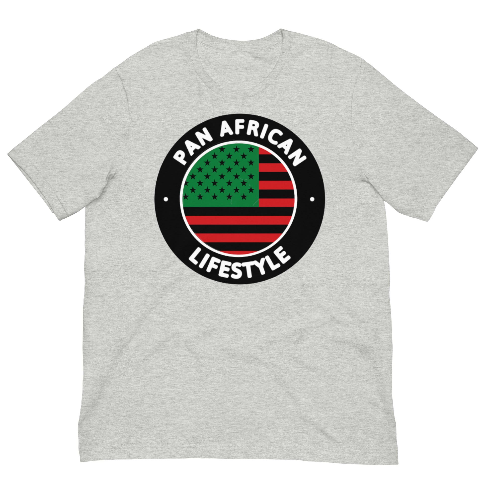 The colorfully inspired Classic Flag tee design of Pan African Lifestyle (PAL) builds upon the classic emblem, incorporating an African flag motif enclosed within concentric circles. The "Pan African Lifestyle" brand name symmetrically spans from top to bottom, contributing to a balanced and open-concept composition that encapsulates the essence of each African country in the centered flag.