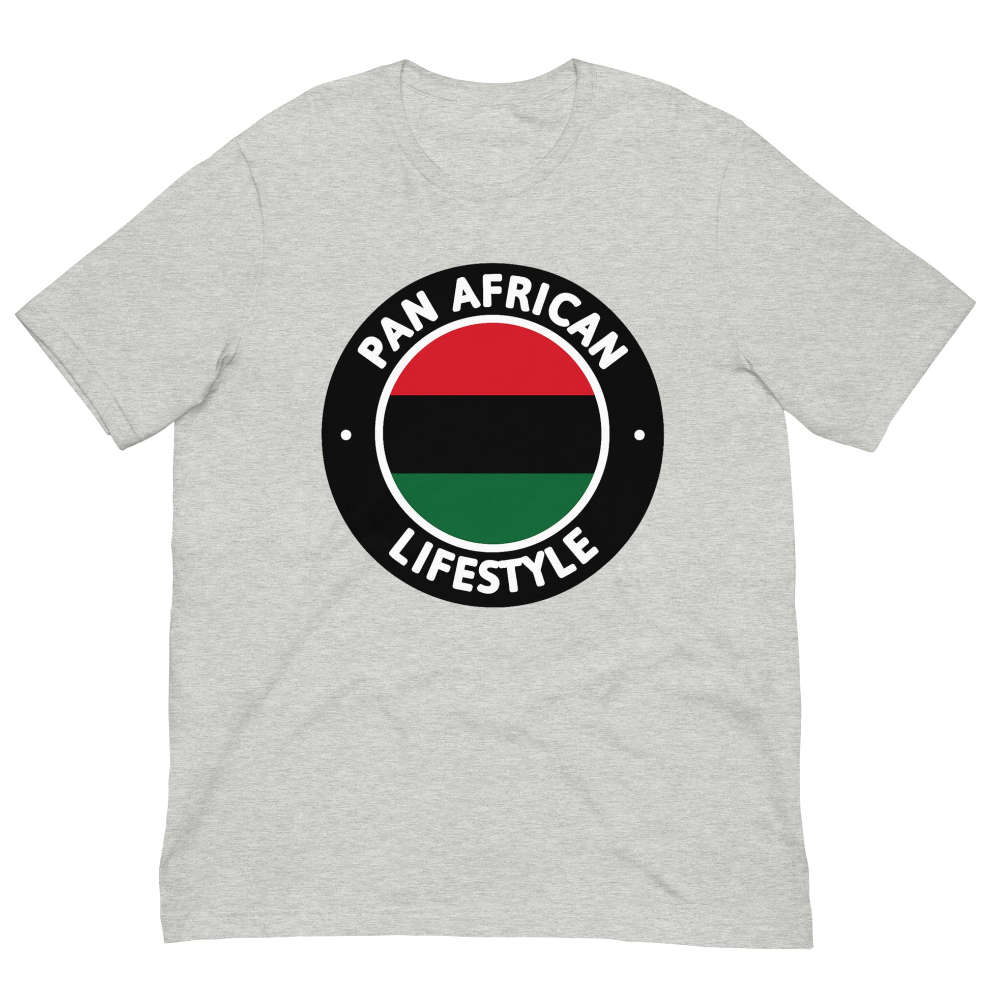 The colorfully inspired Classic Flag tee design of Pan African Lifestyle (PAL) builds upon the classic emblem, incorporating an African flag motif enclosed within concentric circles. The "Pan African Lifestyle" brand name symmetrically spans from top to bottom, contributing to a balanced and open-concept composition that encapsulates the essence of each African country in the centered flag.