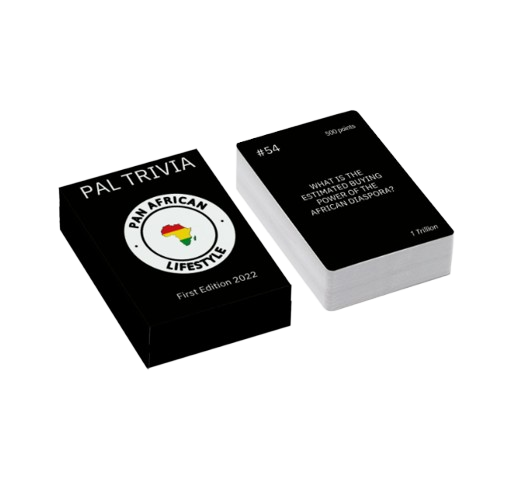PAL Trivia is a party game created with the idea to ease interaction and culture-sharing through entertainment during social gatherings. This gamified trivia experience has become a reference for general African pop culture worldwide. It is a fun casual way for PALS (Pan African Lifestylers) to rep the motherland through gaming. The deck of 54 cards has various questions ranging from easy to difficult and the team or player with the most points wins!