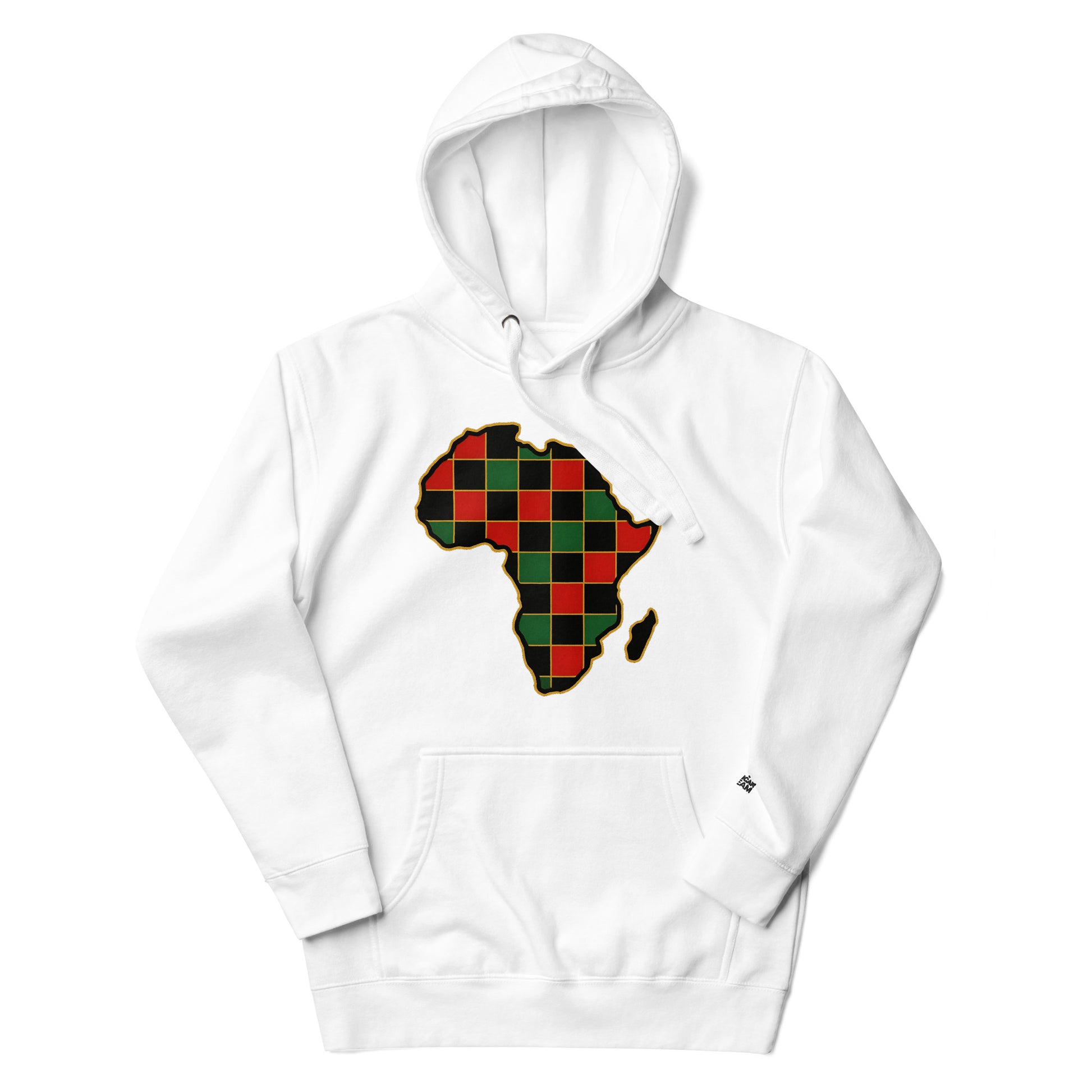 The Pan-African Chessboard Sweatshirt showcases the African continent filled with a chessboard motif in Pan-African colors, elegantly outlined in gold.