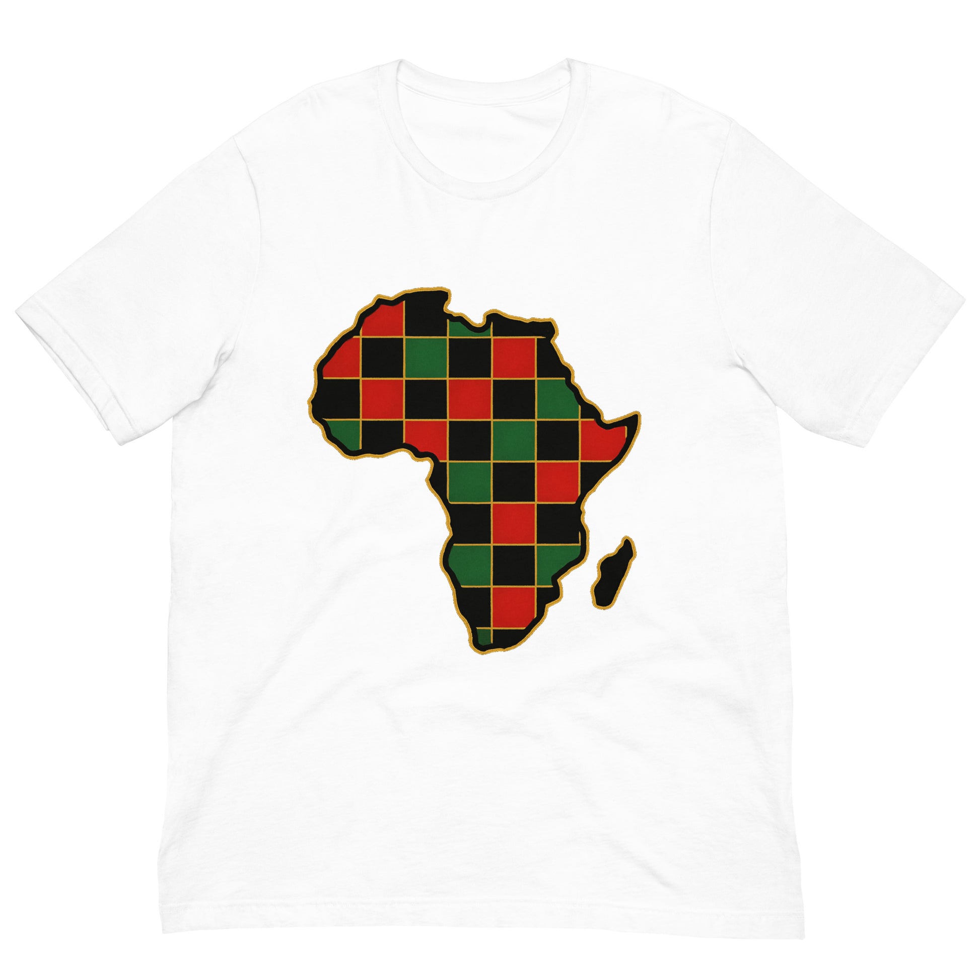The Pan-African Chessboard Tee showcases the African continent filled with a chessboard motif in Pan-African colors, elegantly outlined in gold