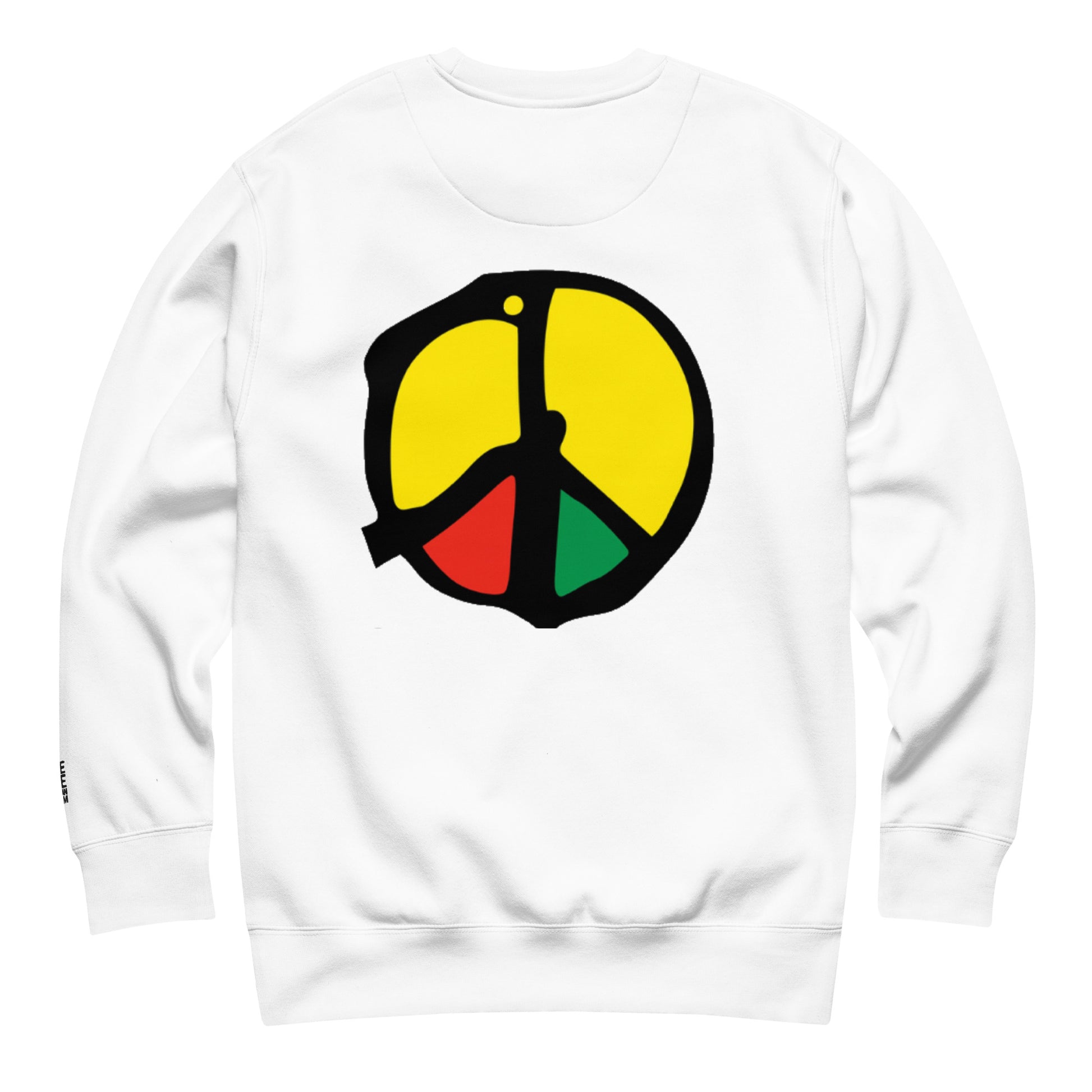 The Peace & Pan-Africanism Sweatshirt features a hand-drawn Pan-African peace symbol in vibrant yellow, red, and green, outlined in black. The message “Peace & Pan-Africanism”, in minimalist, bold, handwriting.