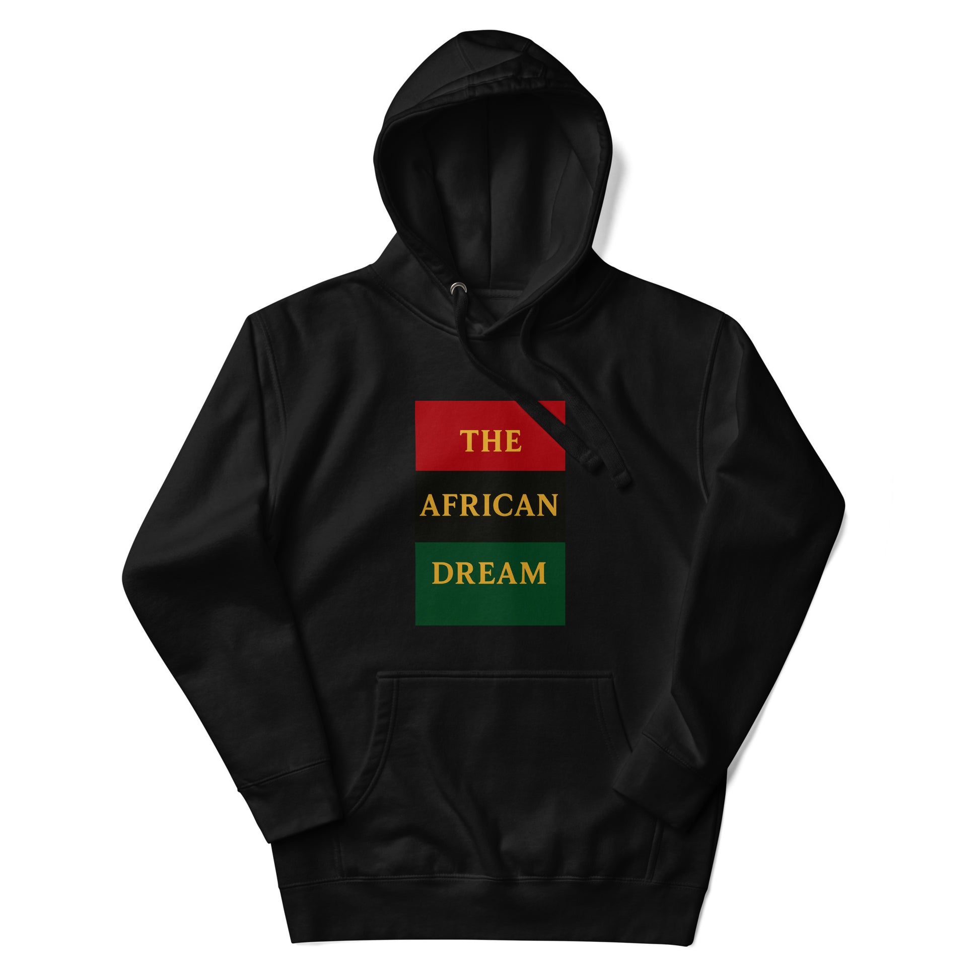 A bold Pan African flag design with the words THE AFRICAN DREAM in shimmering gold placed within each color bar red black and green symbolizing unity pride and aspiration.