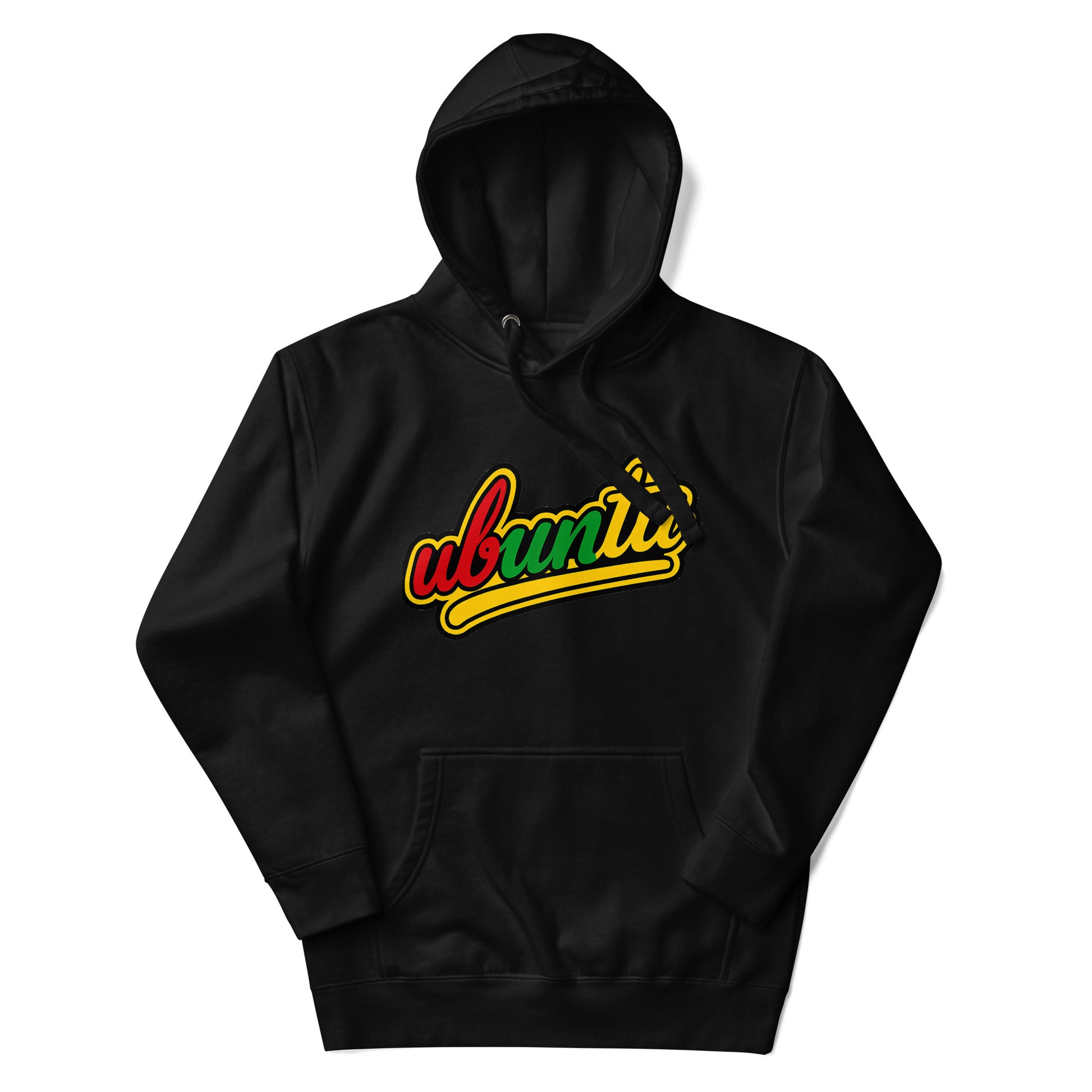 The bold, cursive ‘Ubuntu’ font, featuring vibrant red, green, and yellow hues inspired by Pan-African and Rastafarian colors, celebrates the African philosophy of Ubuntu.