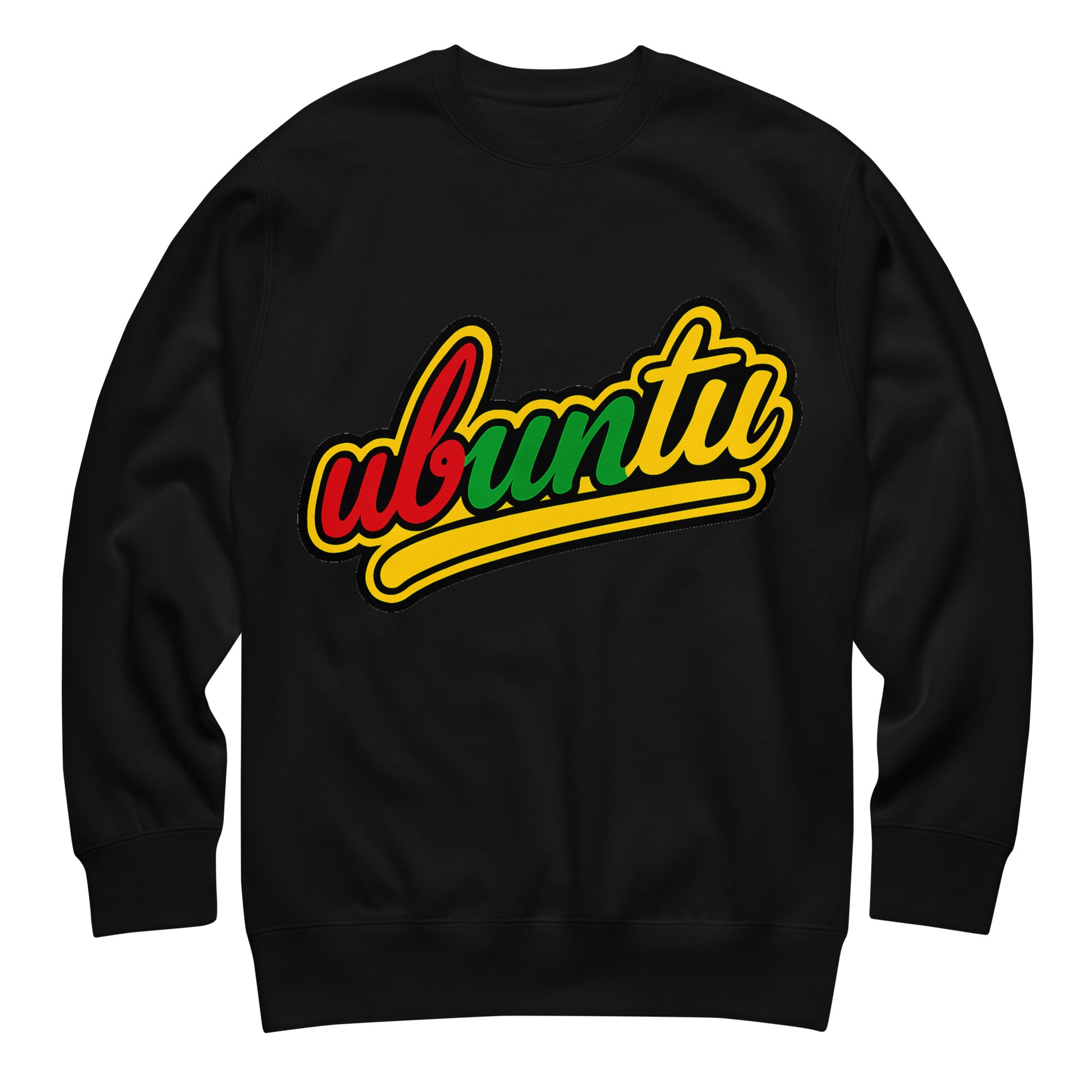 The bold, cursive ‘Ubuntu’ font, featuring vibrant red, green, and yellow hues inspired by Pan-African and Rastafarian colors, celebrates the African philosophy of Ubuntu.